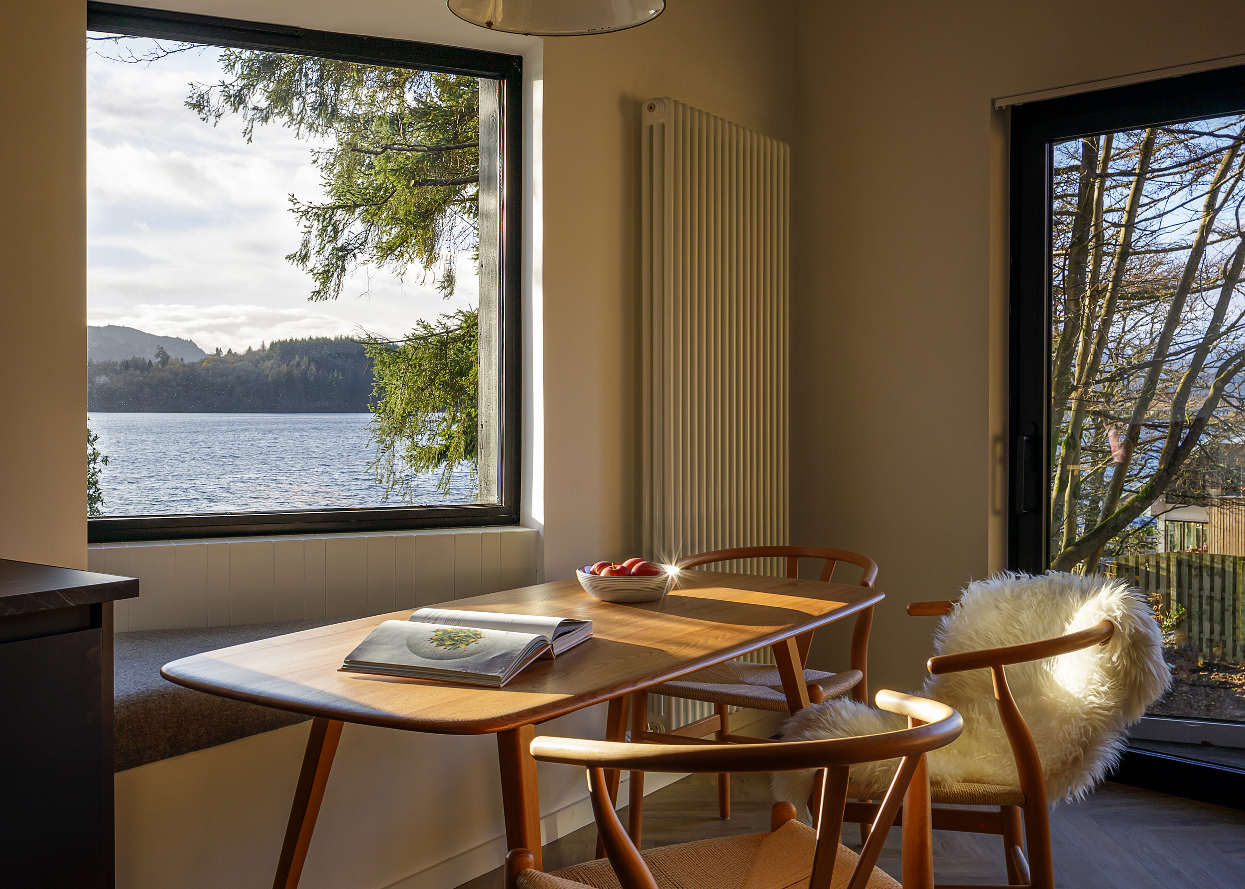 Large patio doors open onto a covered balcony, angled perfectly for loch and mountain views. Sit here whatever the weather, wrapped in blankets, watching the light change over Ben Venue.