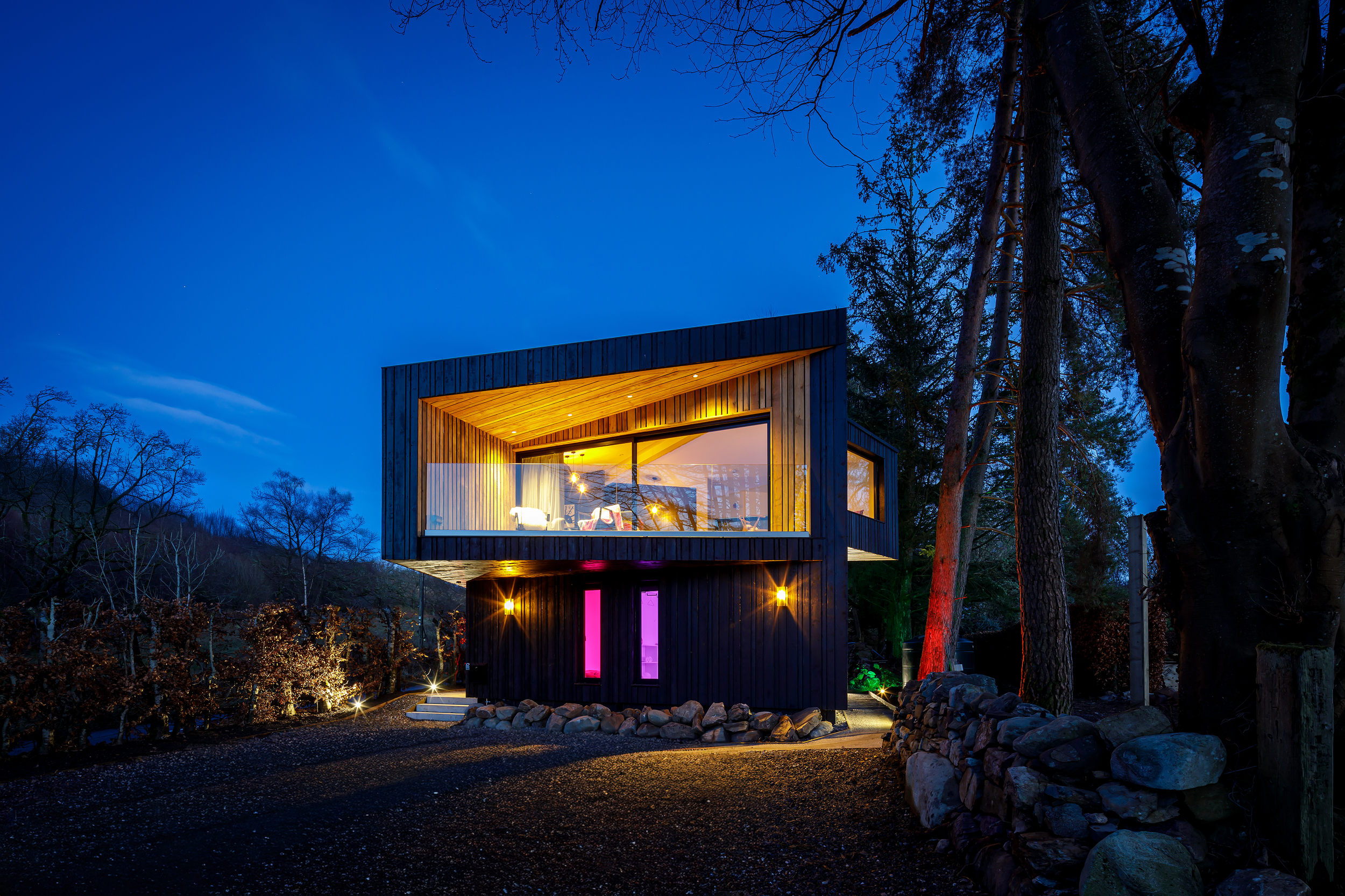 Designed by Cameron Webster Architects and built by our sister company, nest, Coorie is an upside-down house — living spaces above to capture the views, bedrooms below for quiet and rest. The result is a feeling of living within the trees, with the loch always present.